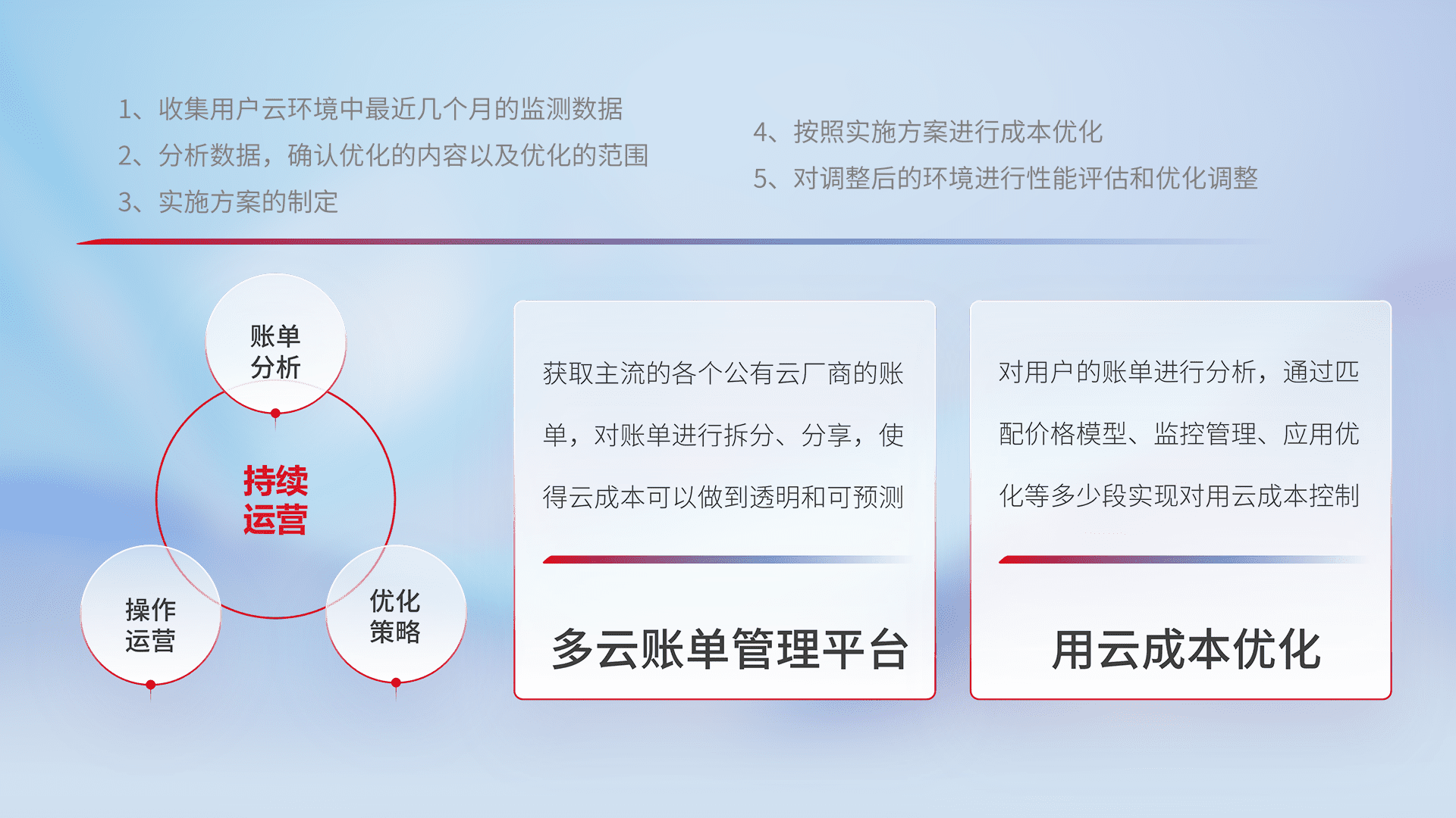 通过多云纳管,,,以统一的资源数据模型把客户的云资源进行抽象和封装,,,,进而实现对多云资源的统一操作,,,,保障云资源管理的可靠性、、、、稳定性与可用性。。量身定制化运维内容,,配置、、、、开发运维、、、补丁管理、、备份、、监控、、、、认证和访问管理、、审计和日常巡检等,,,保障在用云过程中的可靠度,,,,稳定度以及高可用率。。。