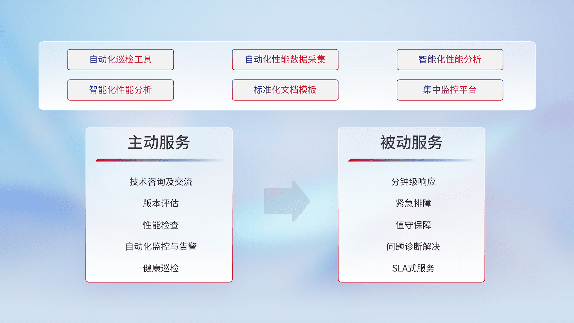 智能化工具和标准化文档,,,,保障服务质量,,提供主动服务(包含技术咨询、、、版本评估、、、性能检查、、自动化监控与告警、、健康巡检)和被动服务包含(分钟级响应、、紧急排障、、、值守保障、、、、问题诊断解决、、、SLA服务)。。