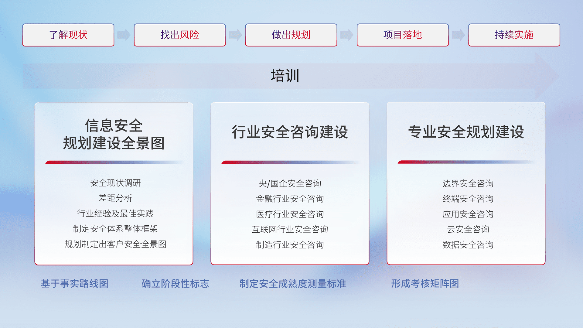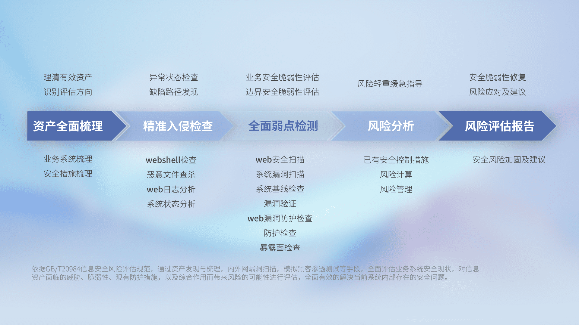 针对客户行业特性,,,以专业的安全服务+多厂商联合解决方案提供专属的一站式安全管理服务,,,帮助客户全面感知网络空间威胁,,,基于识别、、、检测、、、、分析、、、、防护、、监测、、、、响应的服务理论模型,,从方案咨询、、、、集成交付、、、评估验证、、优化加固、、、运维运营,,,致力于为客户提供完整的闭环管理式安全服务。。。。以实战经验为客户打造高抵御风险的安全体系,,帮助客户发现威胁、、、、对抗威胁、、、、处置威胁,,不断积累安全对抗能力,,,持续保障数字化安全。。。